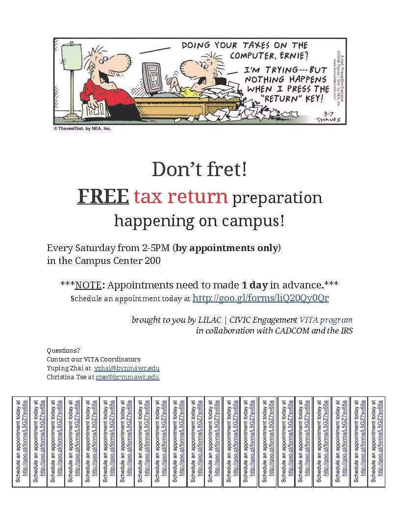 Would you like some assistance with tax returns? IRS-certified student volunteers will provide free tax return preparation appointments this semester! Every Saturday from 2-5pm, VITA (Volunteer Income Tax Assistance) volunteers will be available for tax preparation appointments at Campus Center 200. You must schedule an appointment at least 24 hours in advance on the Google Form and complete an appointment form (link: vita-brynmawr.mypaysimple.com). This volunteer service is provided by VITA and sponsored by Civic Engagement Office.