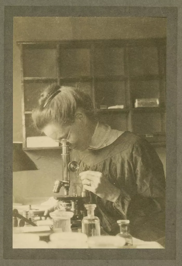 By coincidence, a recent Genetics Society of America profile of Stevens includes a 1909 photo from Bryn Mawr’s archives of Stevens working at the Stazione Zoologica in Naples, Italy, using a similar microscope. The article is titled Nettie Stevens: Sex chromosomes and sexism and is worth a read.