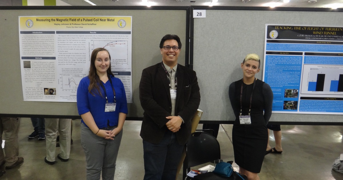 Codie's work focused on data taken at the Swarthmore Spheromak Experiment at Swarthmore College as part of a collaborative project between Bryn Mawr and Swarthmore that looks at accelerating magnetized plasma structures using a current pulsed copper ring. Codie studied the change in velocity of these structures due to different boundary conditions. Hayley's work was also connected to the joint project. She looked at the effect of metal proximity with respect to the amount of magnetic field produced by the pulsed coil. Hayley and Codie attended the first two days of the conference where they were able to see a wide variety of talks on topics ranging from fusion to astrophysical plasma, as well as interact with a number of other students and researchers in the community.
