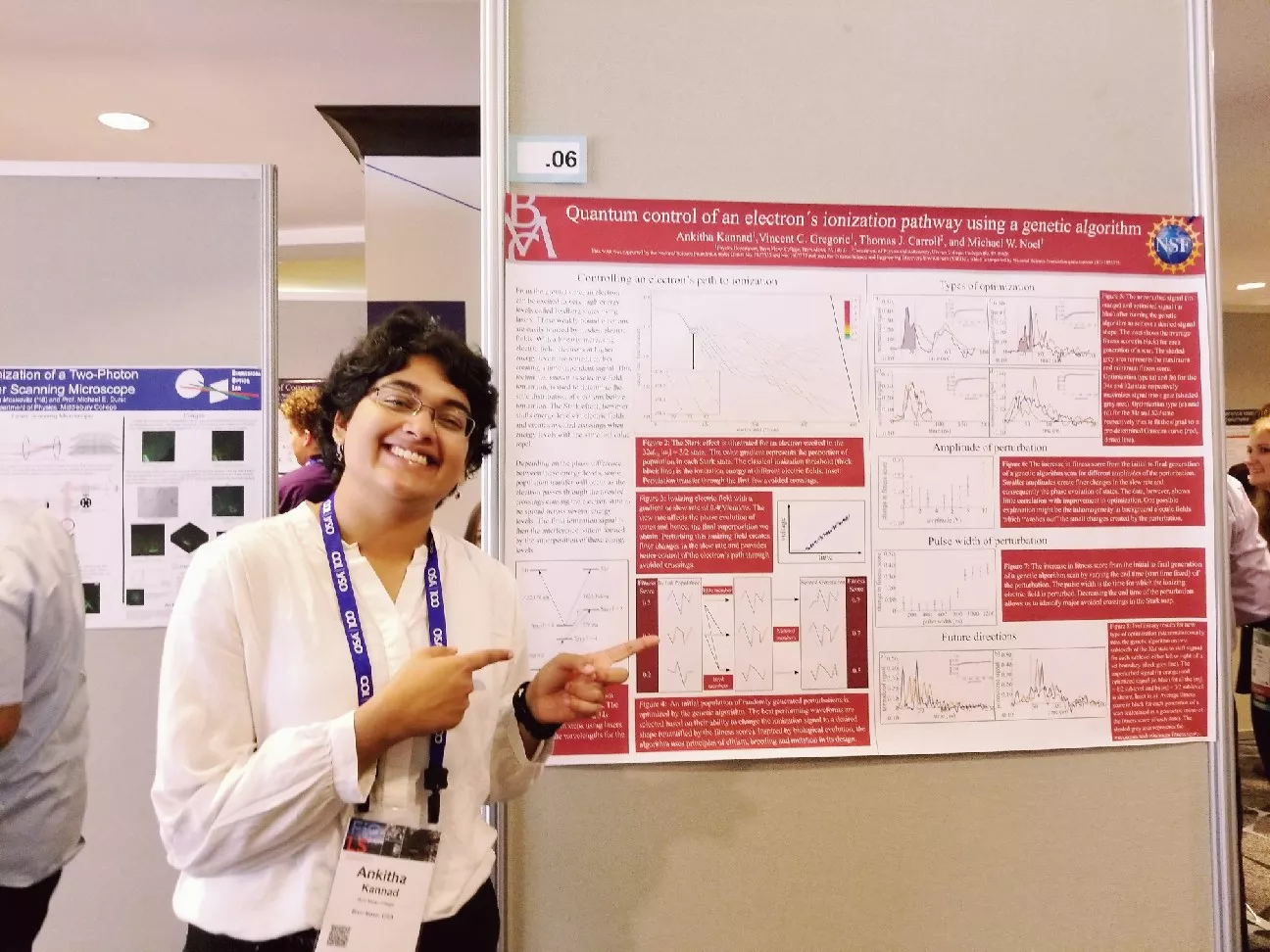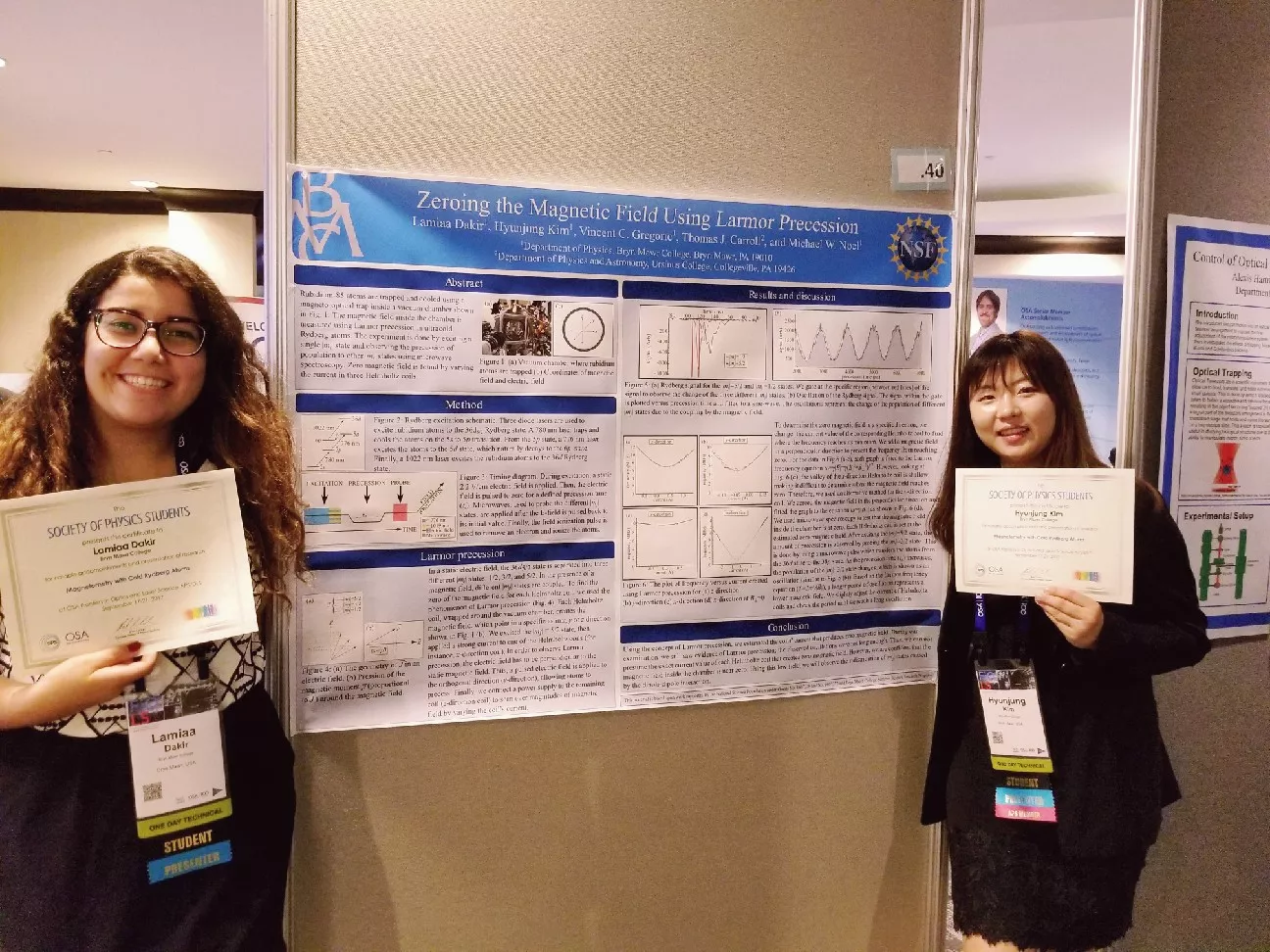 Ankitha Kannad '19, Hyunjung kim '19, and Lamiaa Dakir '20 traveled to Washington, D.C. to present posters on research they conducted in Professor Mike Noel's laboratory over the summer. Lamiaa and Hyunjung described their work in zeroing the magnetic field in the laser trap in order to conduct Larmor precession studies. Ankitha showed her latest results using a genetic algorithm to control ionization pathways in Rydberg atoms. The Bryn Mawr students met up with undergrads from Ursinus College who are mentored by Prof. Tom Carroll. Tom is a Bryn Mawr Physics Ph.D. graduate and Prof. Noel's current collaborator.